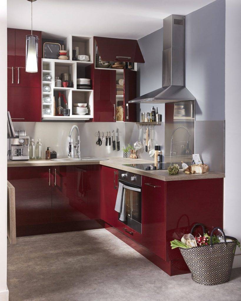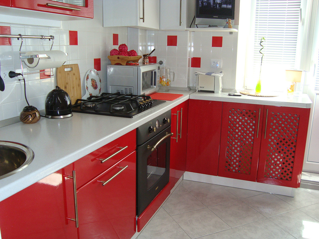 - Чем меньше кухня, тем светлее должен быть оттенок красного. Яркий и насыщенный оттенок визуально утяжелит малометражную кухню.