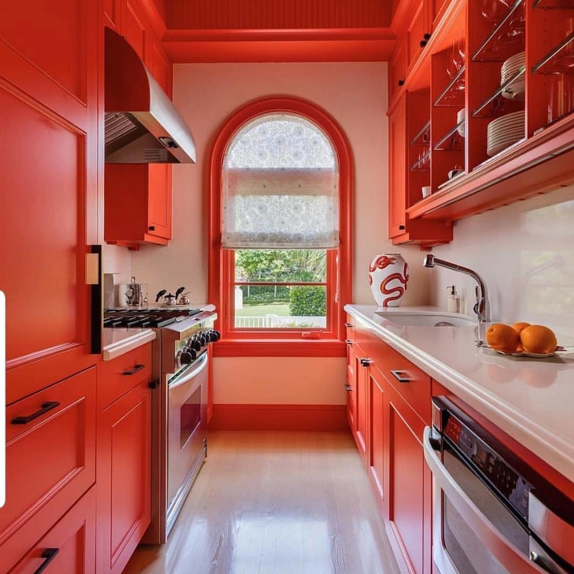 8. Скрытый красный. Яркий оттенок может быть и скрытым, неочевидным: например, так можно оформить внутренние стенки шкафчиков гарнитура или обратную сторону штор.