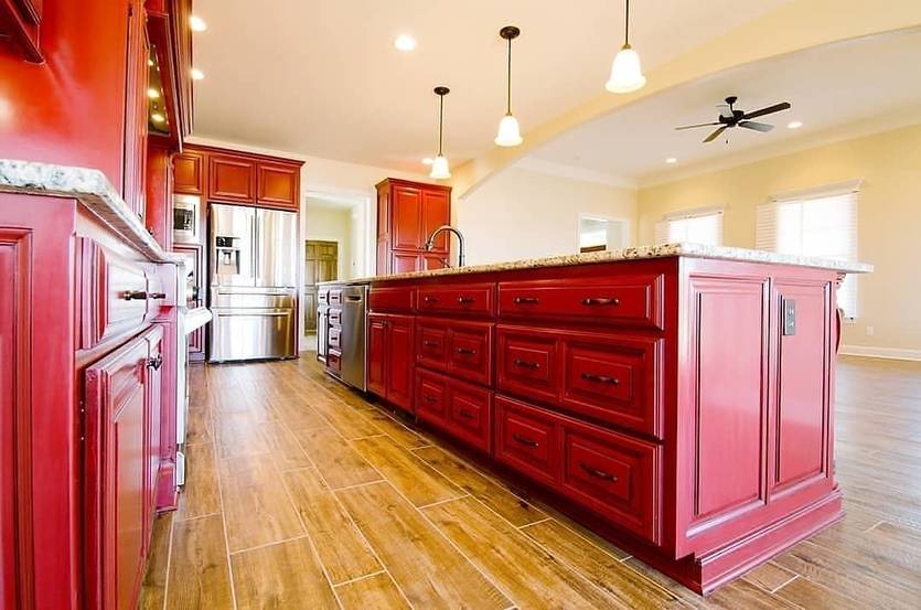 Пол на красной кухне может быть выполнен из дерева, керамической плитки, из керамогранита или ламината. Цвет его зависит от остальной отделки, если преимущество у холодных тонов, выбирают черный или серый, для теплого дизайна подходят оттенки белого и бежевый. Напольное покрытие может имитировать натуральные отделочные материалы, например, дерево или бетон.