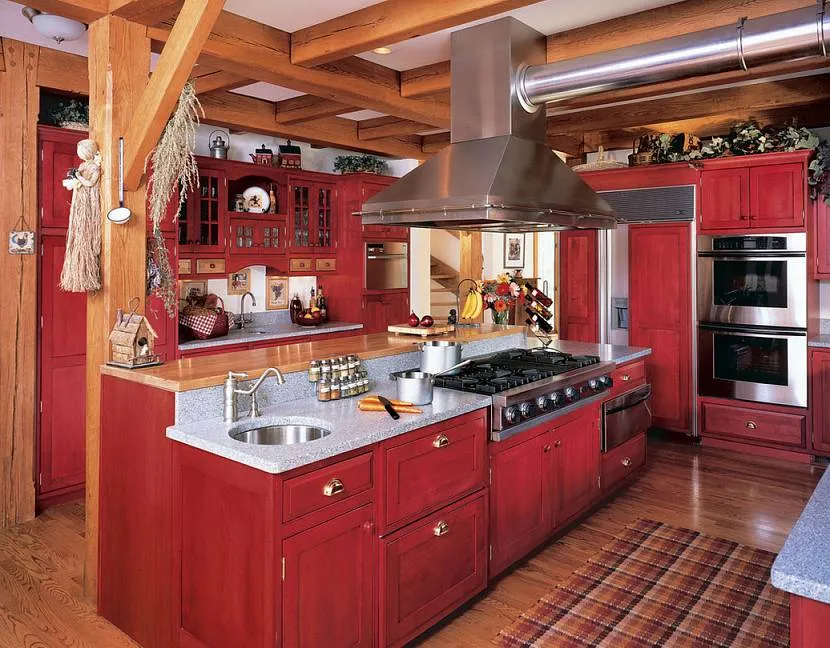 10. Уравновешивание. Снизить активность дизайна кухни с красным гарнитуром можно не только с помощью других цветов. Выбрав для оформления стиль кантри, рустик или минимализм, вы отойдете от ассоциаций с излишней вычурностью