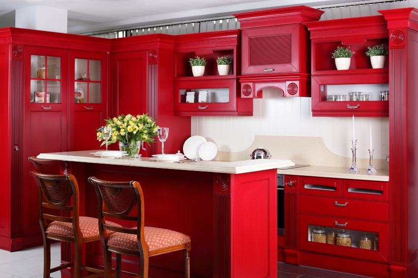 Любые оттенки красного могут стать главными украшениями комнаты. Например, если на кухне ставится алый гарнитур, ее оформление сразу получается ярким, интересным, необычным, привлекательным без дополнительного декора.