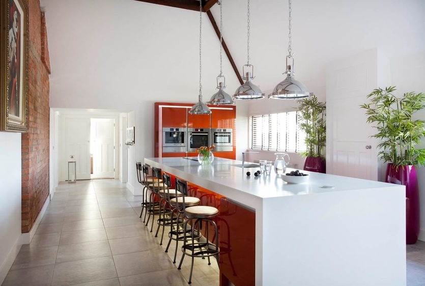 Традиционные по форме кухонные шкафы будут замечательно сочетаться с фантазийной барной стойкой или мягкой мебелью странных форм. Светильники также помогут достичь необходимого эффекта.