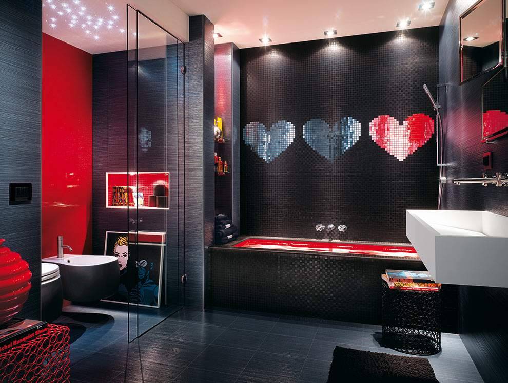 В случае преобладания черного цвета над красным, уместно будет применять в ванной комнате дополнительные осветительные приборы, которые компенсируют недостаток света в помещении. Разнообразная система освещения из источников отраженного света, искусственного и естественного света поможет выгодно «играть» красно-черным краскам в ванной комнате.