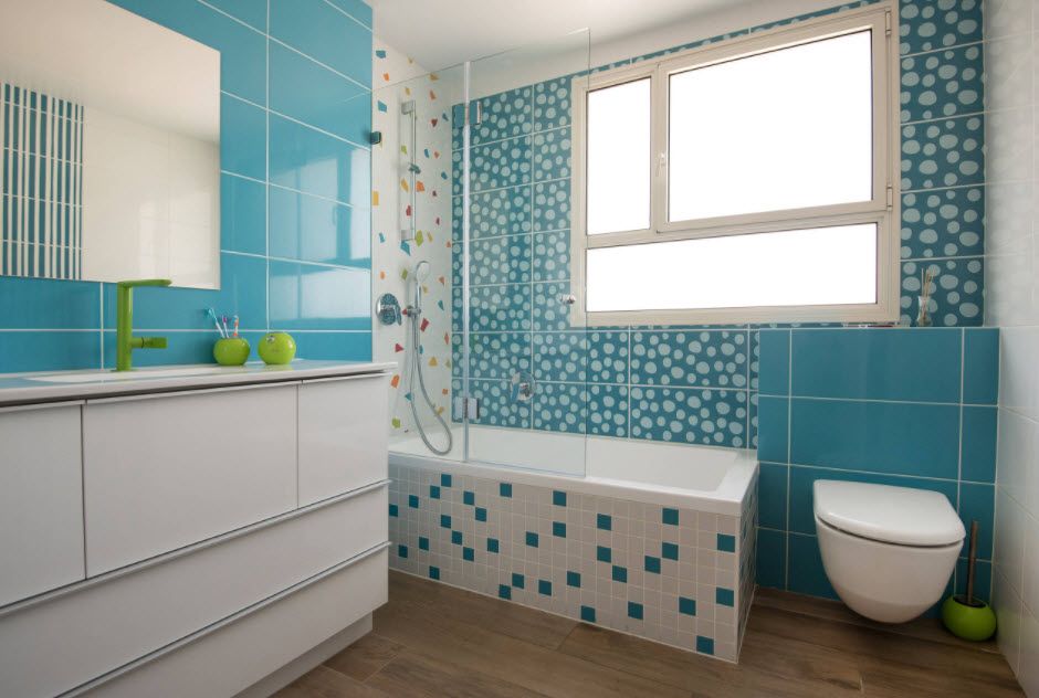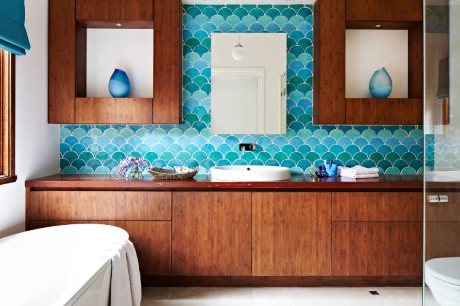 Очень удобно с помощью плитки создавать эффект водной стихии. Синий, голубой и зеленоватый кафель прекрасно подойдет как для оформления стен помещения, так и в качестве напольного покрытия. Гладкая, фактурная или полупрозрачная верхняя часть каждой из плиток позволяет обеспечить игру света, похожую на переливы лучей солнца на водной глади.