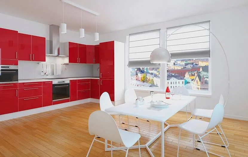 Красная мебель отлично смотрится на фоне ярких стен. Интерьер полон света и в то же время выразителен и эффектен. Вы можете играть с цветами по своему желанию. Красная кухня хорошо сочетается с белоснежным фарфором. Изысканные аксессуары красиво разместятся на рубиновых полках.