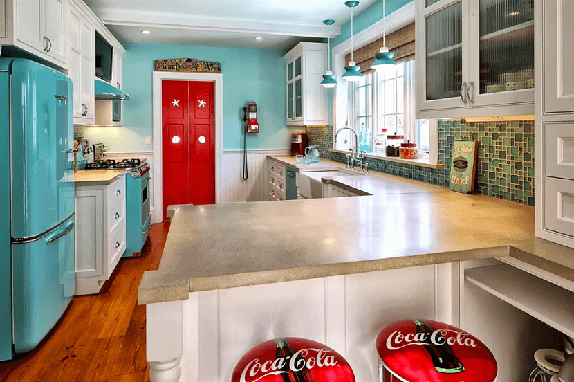 Цветной холодильник в интерьере кухни
