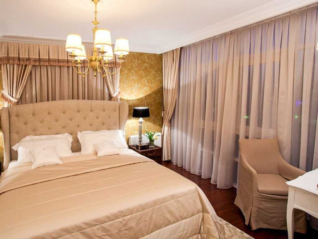 В первую очередь, необходимо учитывать размеры комнаты. Для больших помещений можно использовать помпезные и вычурные варианты, но для небольших комнат лучше всего отказаться от этой идеи и остановиться на обычной классике или римских шторах.