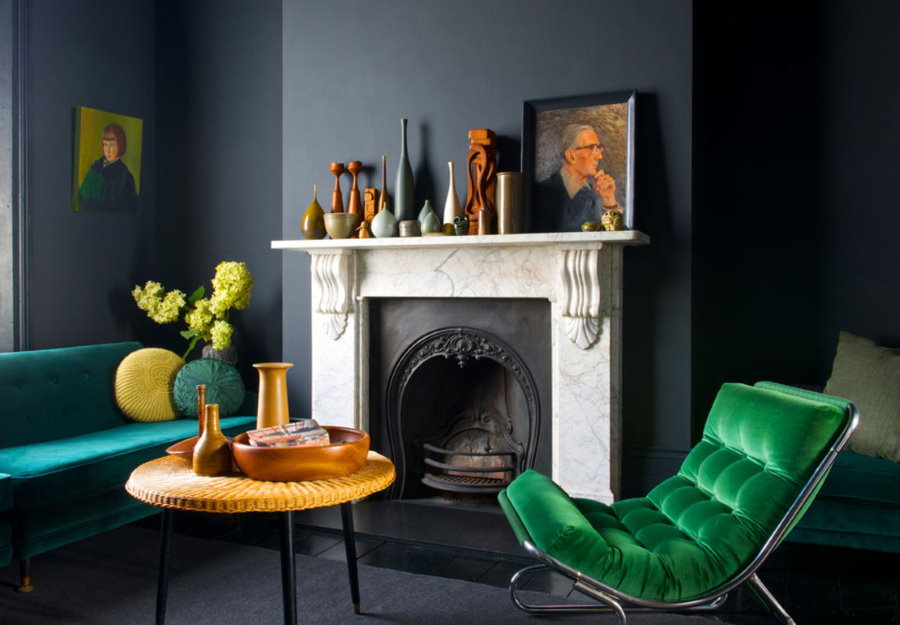 В зону отдыха гостиной с камином отлично впишется зеленое кресло