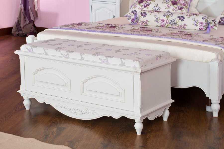 Кровать подбирается классической конструкции в светлых или темных нейтральных оттенках. Изголовье может быть украшено резьбой или обито тканью с цветочным принтом. Оригинально выглядит винтажная кованая конструкция, имеющая плавные изогнутые очертания. Кроме кровати, в комнате чаще всего располагаются старинное трюмо, шкаф или комод, деревянные, плетенные из ротанга или кованые стулья и кресла, прикроватные тумбочки на изогнутых тонких ножках.