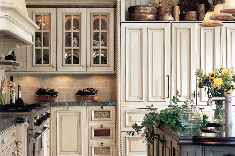 В интерьере кухни стиль отличается деревянной отделкой, раритетной или состаренной мебелью, присутствием цветов. Кухню в стиле прованс украшают букеты, изображения цветов на картинах, неброские цветочные узоры на стенах и фасадах мебели.