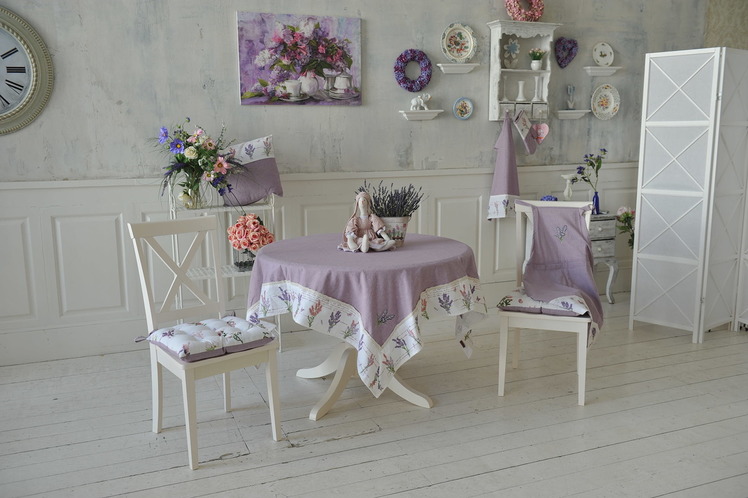 Легкое кружево, мелкие и крупные оборочки придают текстильным вещам легкости. Чаще всего ажурные элементы украшают диванные подушки, занавески, чехлы для мебели. Скатерти, салфетки вышивают простым узором крестик.