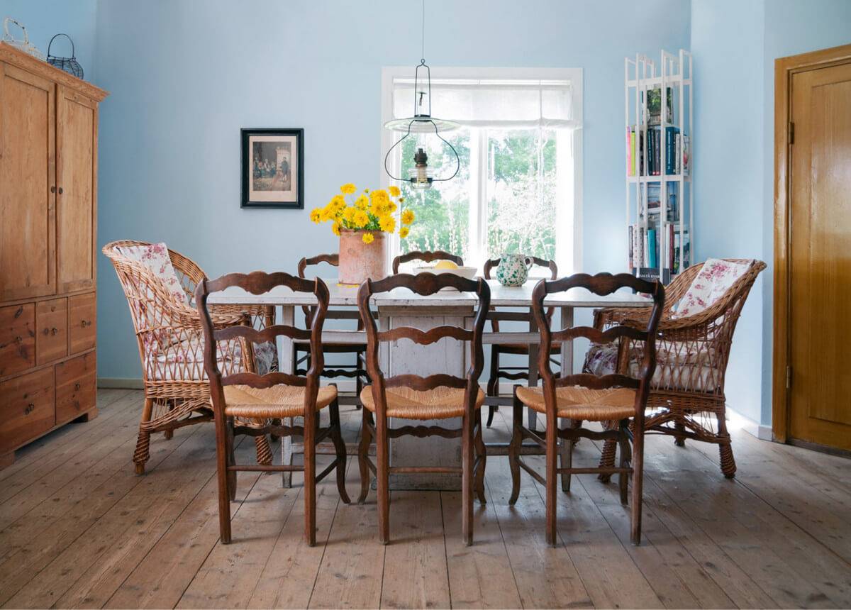 Изысканный и немного наивный стиль никого не оставит равнодушным. Элегантная мебель, натуральные ткани, милые декоративные вещички из фарфора прекрасно вписываются в сельский интерьер. Можно выделить несколько особенностей дизайна: