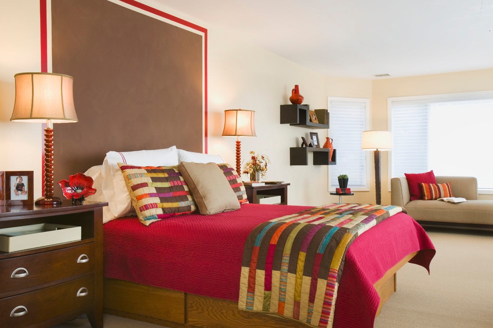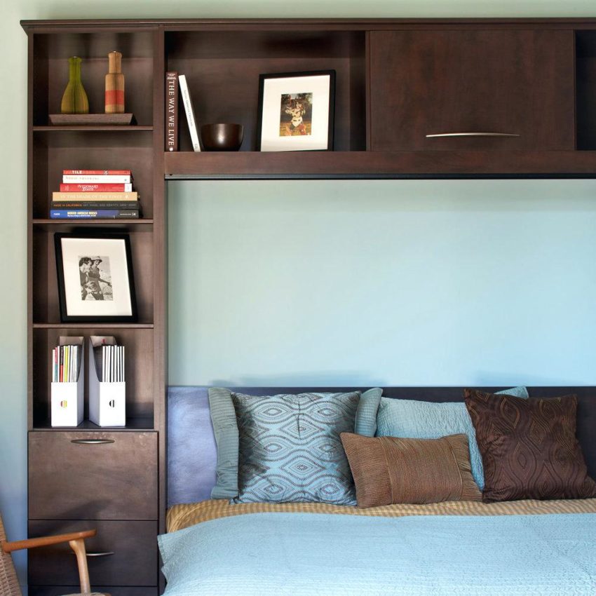 На изголовье можно повесить полочки разных размеров, что является прекрасным решением не только для придания спальне оригинального внешнего вида, но и для удобства.