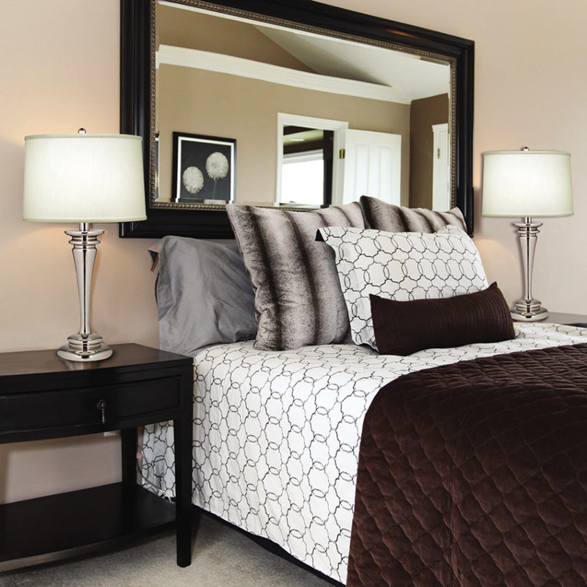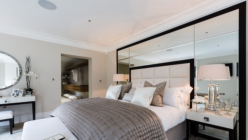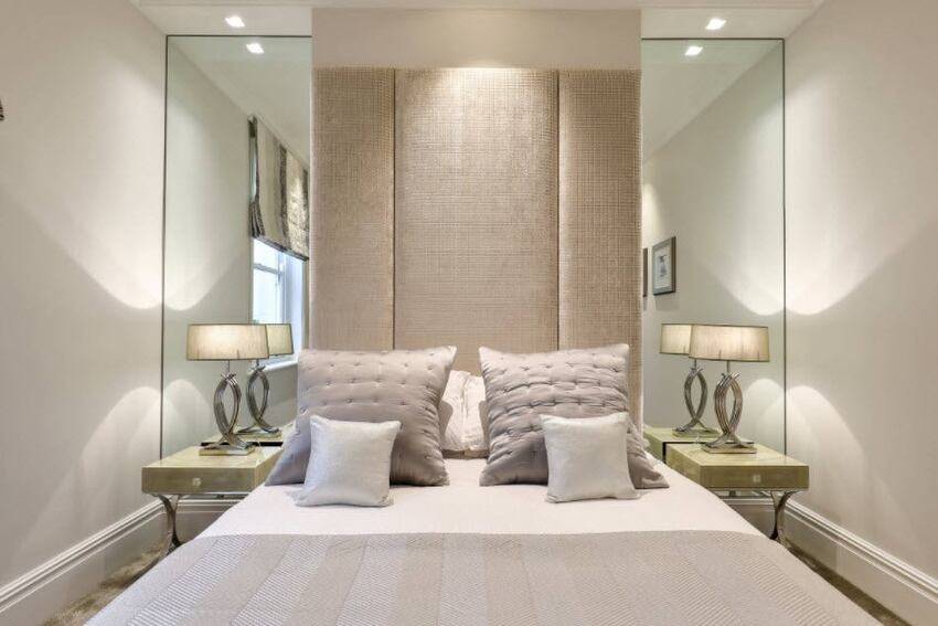 Из нестандартных вариантов оформления изголовья для кровати чаще всего встречается использование зеркала. Его можно повесить сверху и/или по бокам каркаса, что делает комнату более просторной, а интерьер в целом более оригинальным.
