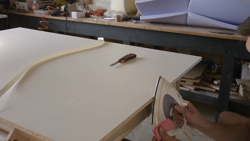 | 2 | ![]() | Подготовьте отрез фанеры для будущего изголовья и обклейте его боковые части лентой с помощью нагревания утюгом. Излишки срежьте канцелярским ножом. |