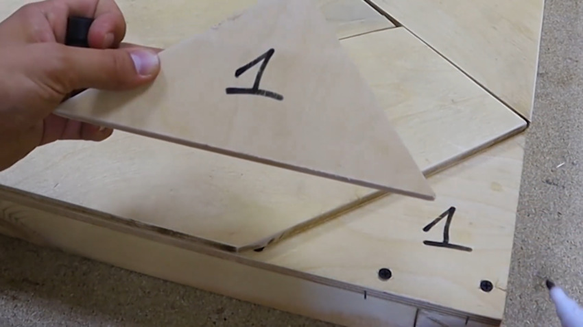 | 17 | ![]() | Затем разложите подготовленные детали по задуманному порядку, следуя нумерации, и зафиксируйте их короткими саморезами, вкручивая их с задней стороны. |