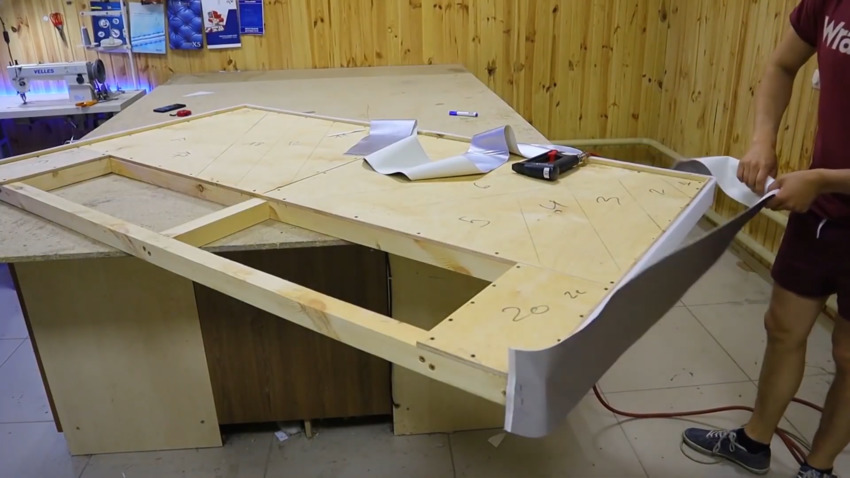 | 16 | ![]() | На каждую рейку аккуратно приклейте полосы поролона ST3040 (10 мм), подходящие по ширине и длине (кроме нижней). Из обивочного материала вырежьте несколько полос, общая длина которых должна совпадать с размерами изголовья. Далее сшейте ткань между собой с помощью швейной машины и закрепите на боковой части изголовья степлером по всему периметру изнаночной стороной внутрь, аккуратно заворачивая полотно. |