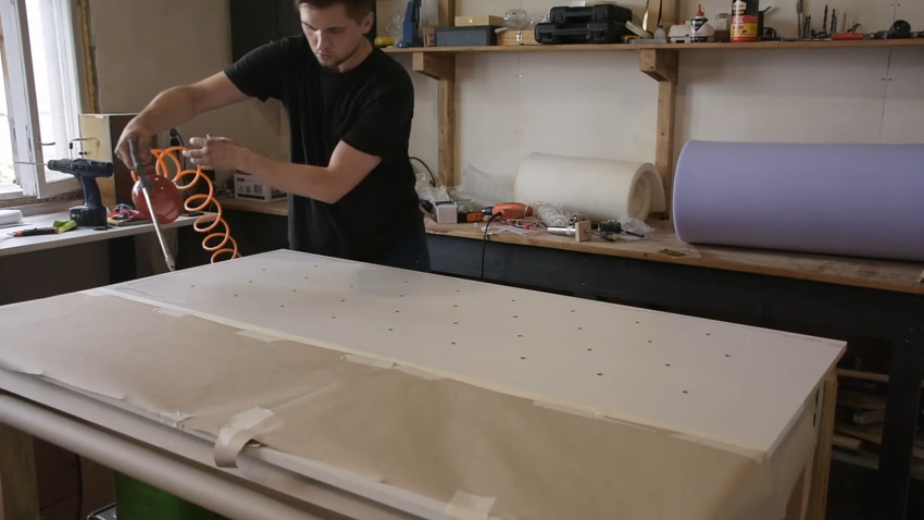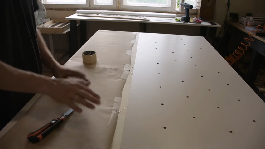 | 4 | ![]() | Просверлите углубления сверлом (10 мм). Затем разделите малярным скотчем разделенные части на фанере. Ту сторону, которая остается без отверстий, накройте бумагой и зафиксируйте ее. |