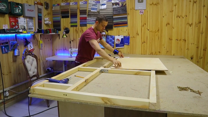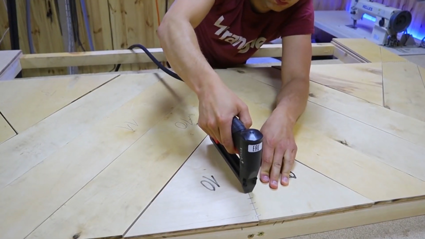 | 5 | ![]() | Разложите их на получившейся конструкции, каждую из частей посадите на клей, закрепите скобами из степлера и зафиксируйте шурупами по всему периметру. |