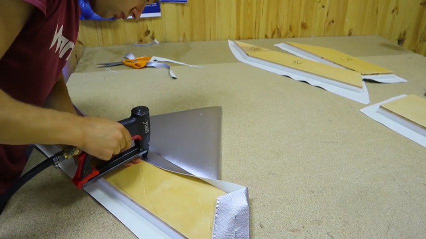 | 14 | ![]() | Заверните и плотно зафискируйте полотно степлером по всему периметру детали. То же самое проделайте со всеми частями. Излишки можно отрезать. |