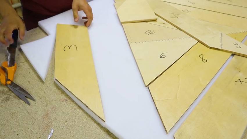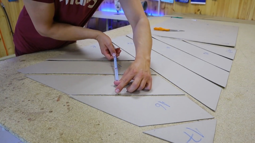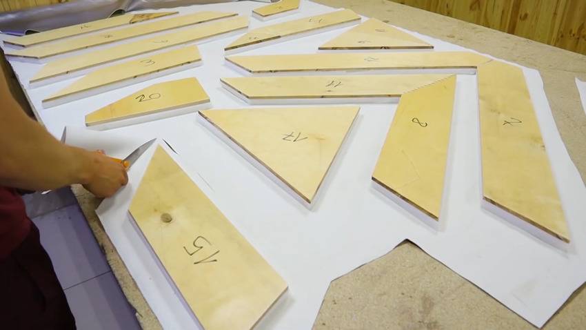 | 8 | ![]() | Далее распилите фанеру на несколько досок, ширина которых должна совпадать со значениями картонных полос. Затем спилите углы, наложив на фанеру картон. |
