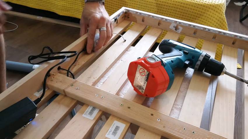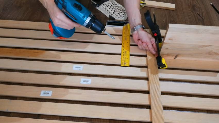 | 15 | ![]() | Подготовьте 4 обработанные рейки, подходящие по размеру к изголовью кровати, и закрепите их по такой же схеме: сначала нанесите клей, затем пройдитесь степлером, после чего вкрутите саморезы, заранее сделав углубления в рейках для них сверлом. |