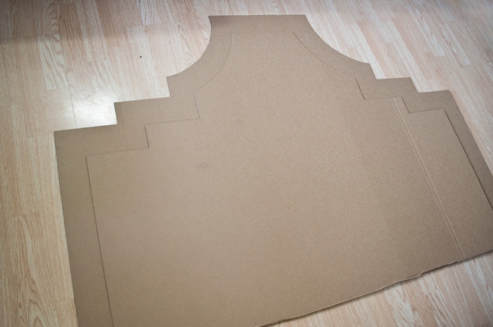 На первом листе картона рисуем контуры изголовья меньшего размера. В данном случае есть округлые части. Чтобы они получились симметричными и ровными, рекомендуем просто обводить емкость круглой формы.