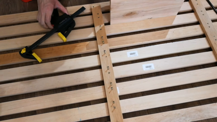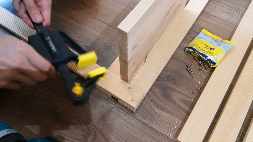 Отрежьте по размеру боковые панели и подножку. Боковые панели перекрывают подножку (и будут стыковаться с изголовьем ). Нанесите полоску клея для дерева по периметру верхней части платформы, по одной стороне за раз для каждой панели. Установите панели на край в клей и закрепите, как показано на картинке. Затем просверлите направляющие отверстия по краям отсеков и закрутите шурупы (также в края подножек).