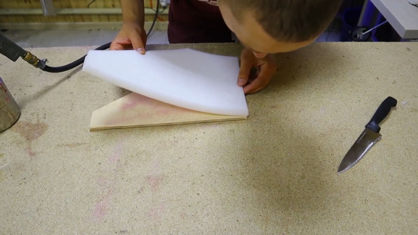| 6 | ![]() | Излишки аккуратно срежьте канцелярским ножом. Сверху приклейте еще 1 слой поролона. На боковину также нанесите клей и заверните ее вниз, слегка прижав руками. Лишний материал срежьте. |