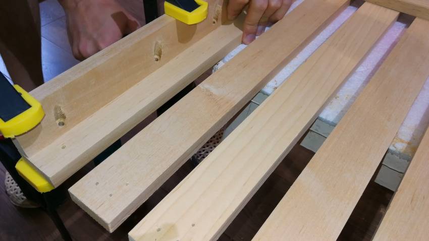 рейкам. Закрепляю прижимной брусок под клин. Наношу клей на торец доски и клиньями