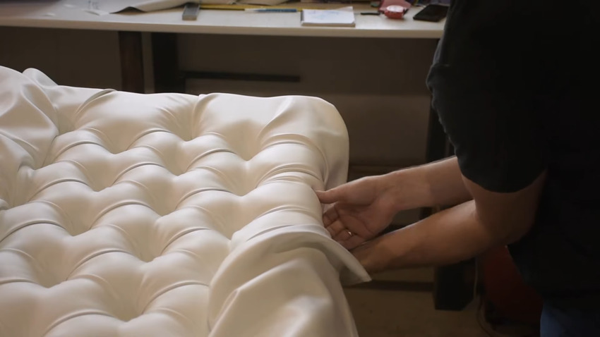 | 10 | ![]() | Сделайте мелком необходимые метки на подготовленном полотне подходящего размера. Накройте изголовье обивочным материалом и приступите к пришиванию пуговиц в обозначенных местах с помощью тонкой веревки и специальной иглы для каретной стяжки. |