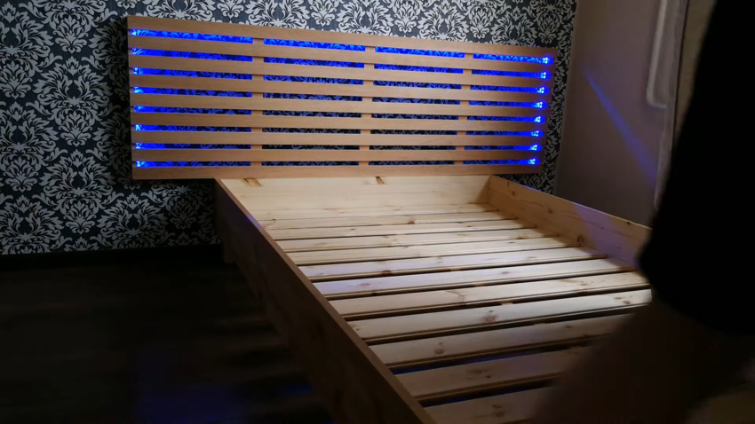 | 9 | ![]() | Пройдитесь наждачной бумагой по боковым частям изголовья, после чего приклейте светодиодную ленту к верхней части реек с внутренней стороны (по желанию). Переключатель посадите на клей. |