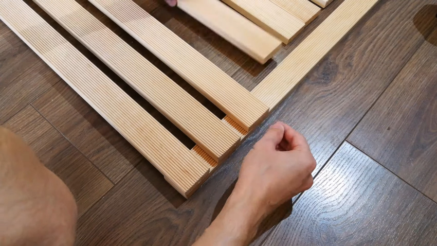 | 2 | ![]() | Для изготовления изголовья подготовьте длинные тонкие рейки (можно рифленые). Разложите их на рабочей поверхности и вставьте полки с каждой стороны для наглядности. |