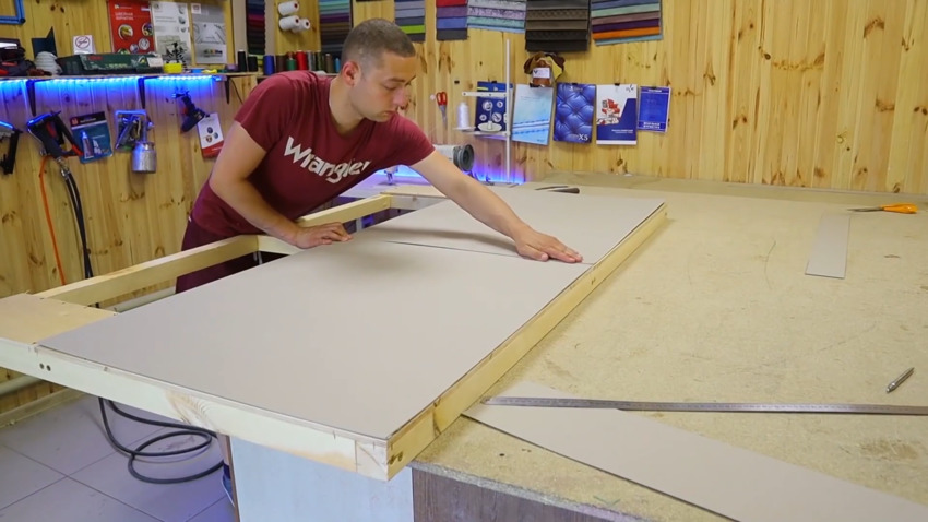 | 6 | ![]() | Затем подготовьте обивочный картон, размер которого должен соответствовать двум крупным частям фанеры. При необходимости склейте картон скотчем. |
