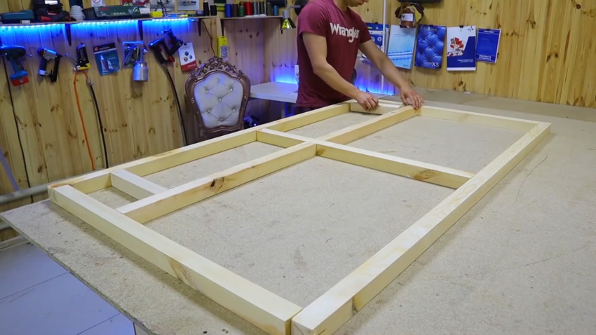 Начал собирать сначала каркас из бруска 50х50 мм. Размер кровать будет 2000х1400 мм. Для меня и моей супруги этого размера будет достаточно, потому что мы оба худенькие. Напили брусок в размер, но с запасом в 10 мм, то есть размер будет 2010х1410 мм. Сделал это для того, что бы с легкостью установить матрас, который будет размером 2000х1400 мм (и не прогадал).