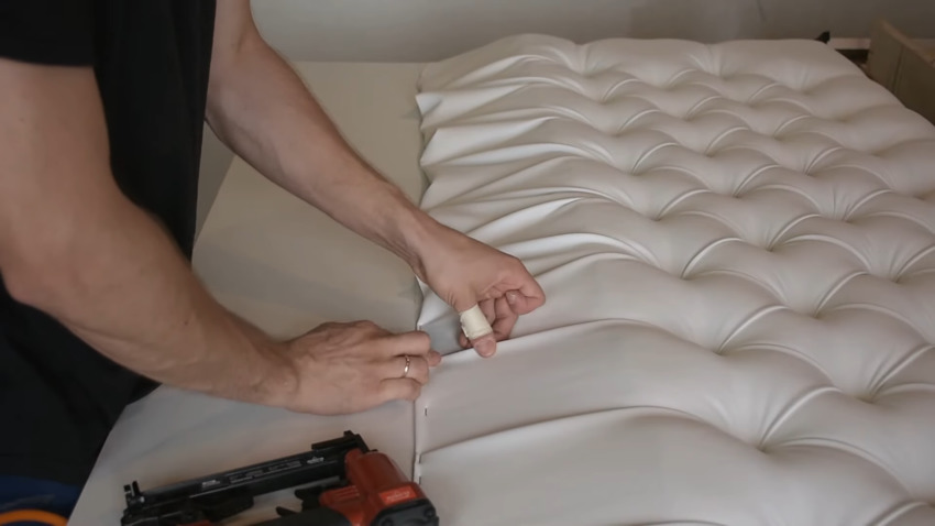 | 11 | ![]() | Затем заверните оставшийся материал на другую сторону верхней части изголовья, хорошо натягивая, и зафиксируйте его степлером. |
