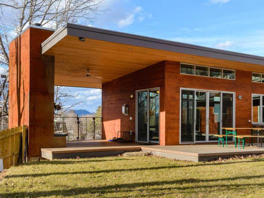 Современное оформление домов предполагает бетонное крыльцо без отделки. Данная пристройка органично дополняет окружающий экстерьер и выгодно подчеркивает текстуру и цвет коттеджа.