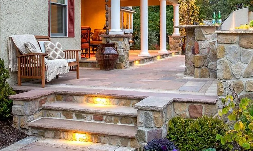 Для облицовки фасада крыльца может быть использован самый разный камень