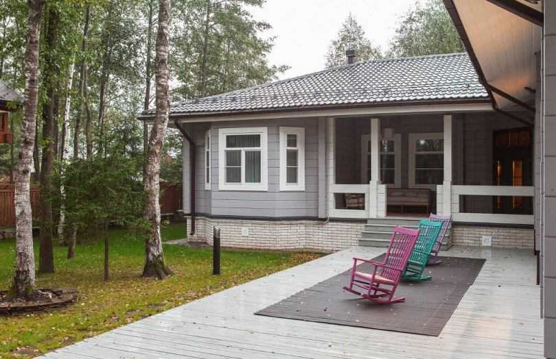 На фото экстерьер загородного дома с деревянным крыльцом.