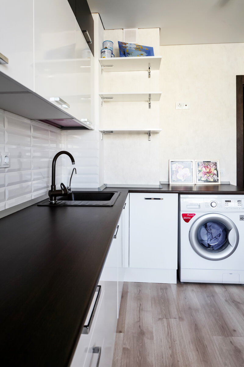 Если не хочется переплачивать за встраиваемую технику, можно поставить на кухню обычную стиральную машинку с фронтальной загрузкой и накрыть столешницей. Тут стоит учитывать ее высоту, но техника достаточно стандартна — около 85 сантиметров. Такая же и высота стандартной столешницы.
