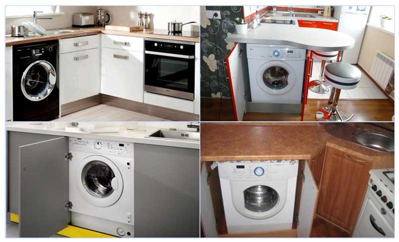 Существует большое количество способов установки встроенной стиральной машинки на кухне. Большинство из них направлены на то, чтобы спрятать технику с видного места и не нарушать целостность стиля.