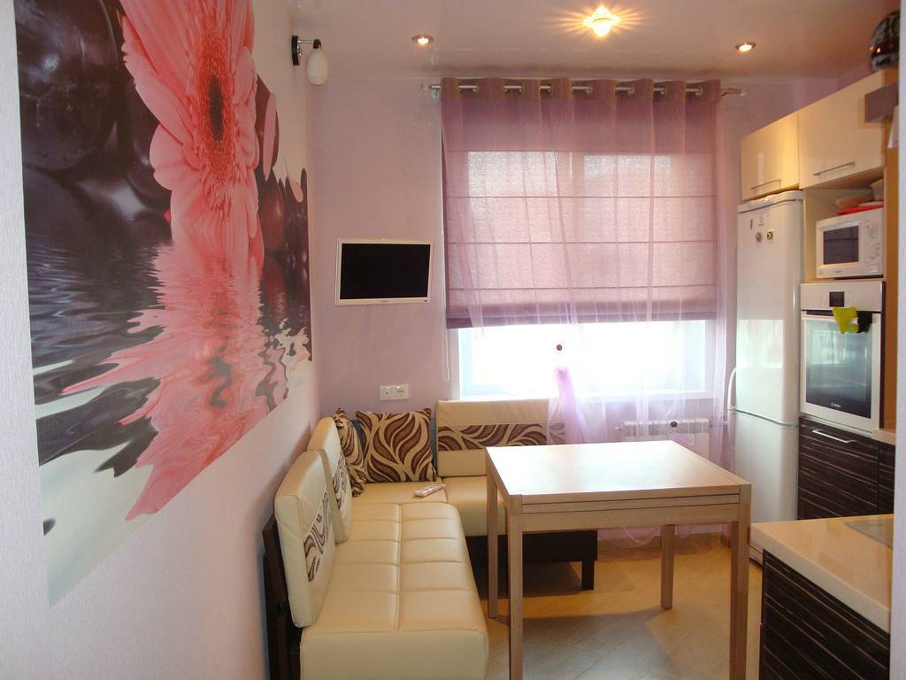 - диван в сочетании с настенной аппаратурой сделает кухню удобной для ежевечерних просмотров телевизора или фильмов;