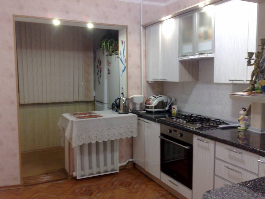 Если есть балкон, можно сделать перепланировку помещения — нужно просто убрать стену. Разрушать ее полностью не стоит, можно оставить нижнюю часть (до подоконника), соорудив из нее барную стойку. Она может выполнять роль обеденного стола, таким образом, на кухне появится больше свободного места.