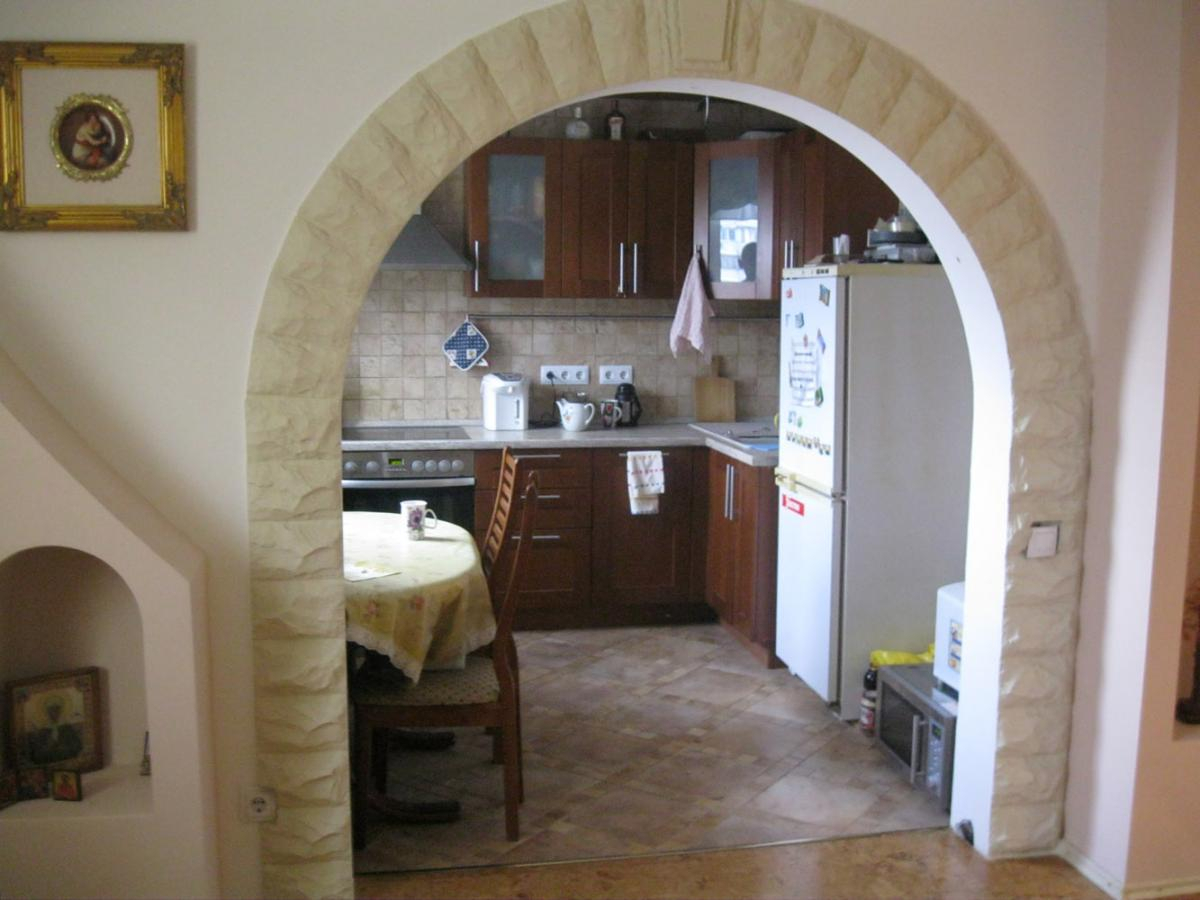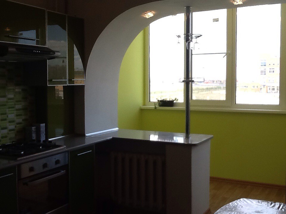 Кухню и присоединенный балкон можно зрительно разделить аркой или барной стойкой