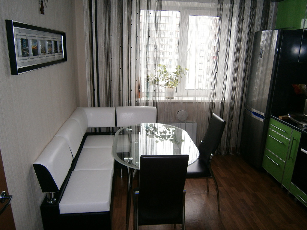 Особенно тщательно подходите к выбору мебели (она может быть встроенной, но никак не угловой). Гарнитур и стол не должны мешать передвижению, но они должны соответствовать вашему стилю и вкусу. Большой объем прозрачного пластика или стекла расширит ваш интерьер и придаст ему изысканности.