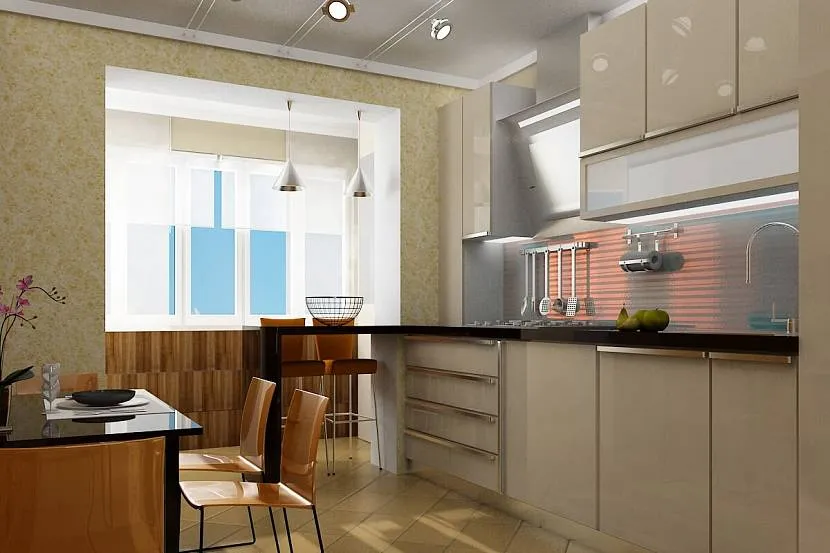 Балкон, соединенный с кухней, позволяет увеличить пространство помещения. Можно убрать оконную раму, утеплить балкон и разместились на нем небольшую обеденную зону или барную стойку.