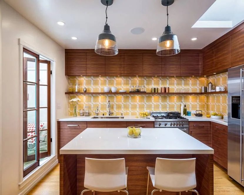 Если проход между мебелью небольшой, постелите на пол ковры с горизонтальным рисунком или сделайте продольный рисунок на полу. А вот поперечный рисунок, напротив, зрительно уменьшит кухню.