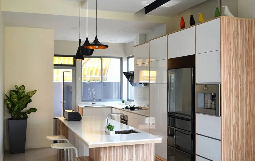 Чтобы пространство не выглядело перегруженным, для дизайна кухни 13 метров отдайте предпочтение светлым тонам в оформлении, а также замените закрытые шкафы верхнего яруса открытыми полками.