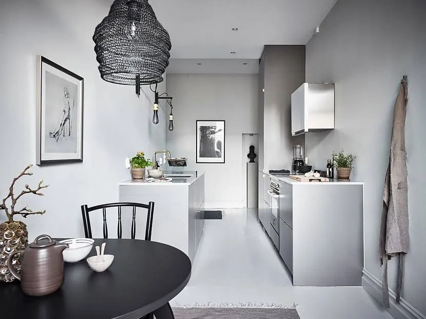Если ваша кухня является проходной комнатой – параллельное расположение кухонного гарнитура может стать единственным эффективным способом распределения предметов интерьера. При такой компоновке система хранения и встроенная бытовая техника расположены на двух параллельных стенах, самых длинных в прямоугольной комнате. Это позволит использовать больше места для хранения посуды.