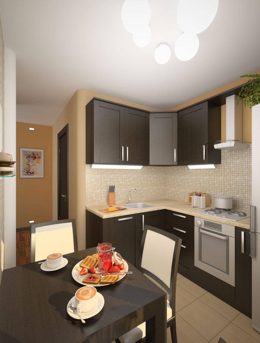 Одновременно с этим дизайн малогабаритной кухни 5 кв. м должен подбираться таким образом, чтобы между местом хранения и приготовления продуктов и обеденной зоной было расстояние не меньше 1,5 метров